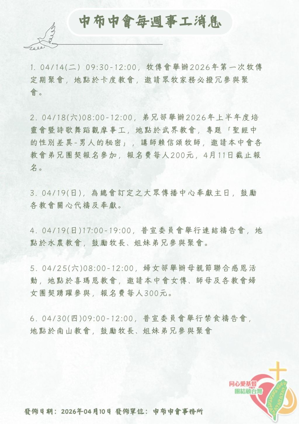 【中布中會每週事工消息】 發佈日期:2026年4月10日