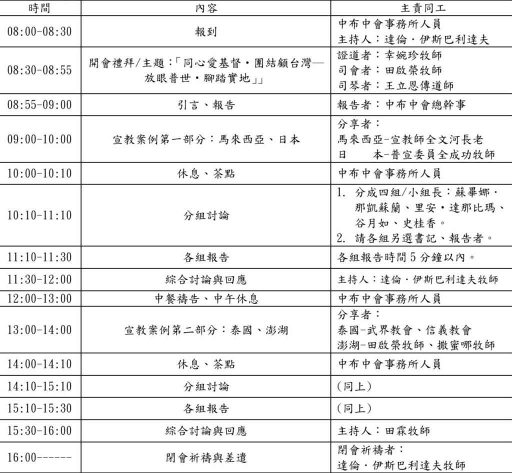 * 對象:中布中會牧傳同工、各教會代議長老1名、各教會代表3至7名、各部會部長。